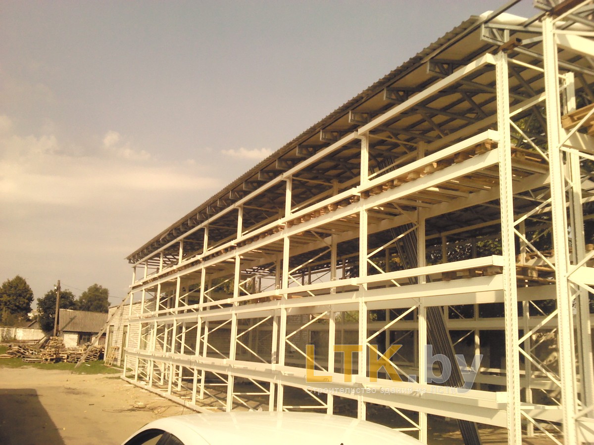На фотографиях представлено оригинальное по своей простоте и практичности решение: в качестве опорных конструкций и стен склада выступают стеллажи, выполненные из профильного стального проката. По периметру каркаса по стойкам стеллажей выполнена обвязка из стального швеллера. На данный швеллер устанавливается кровельная система из ЛСТК ферм и прогонов.