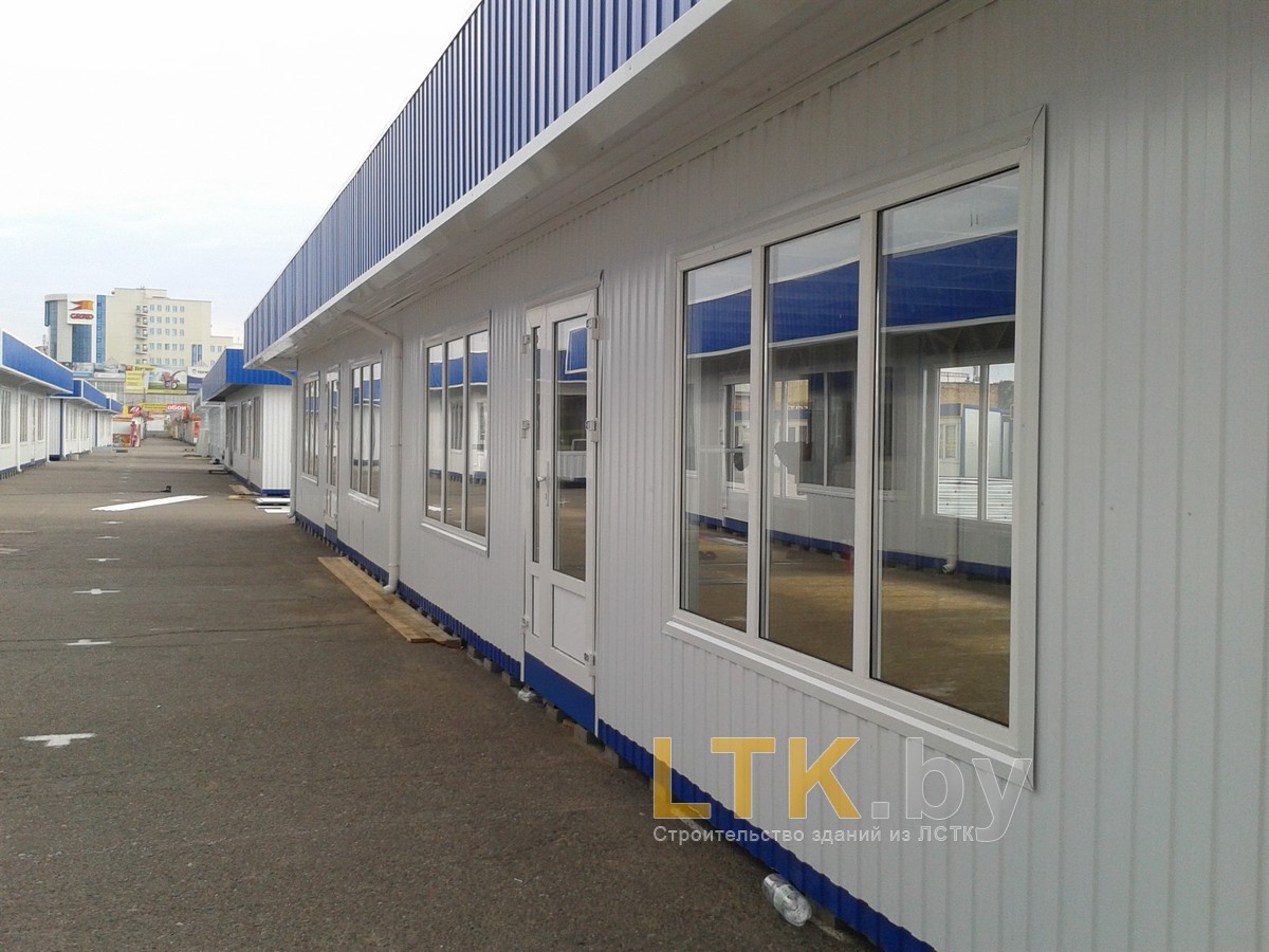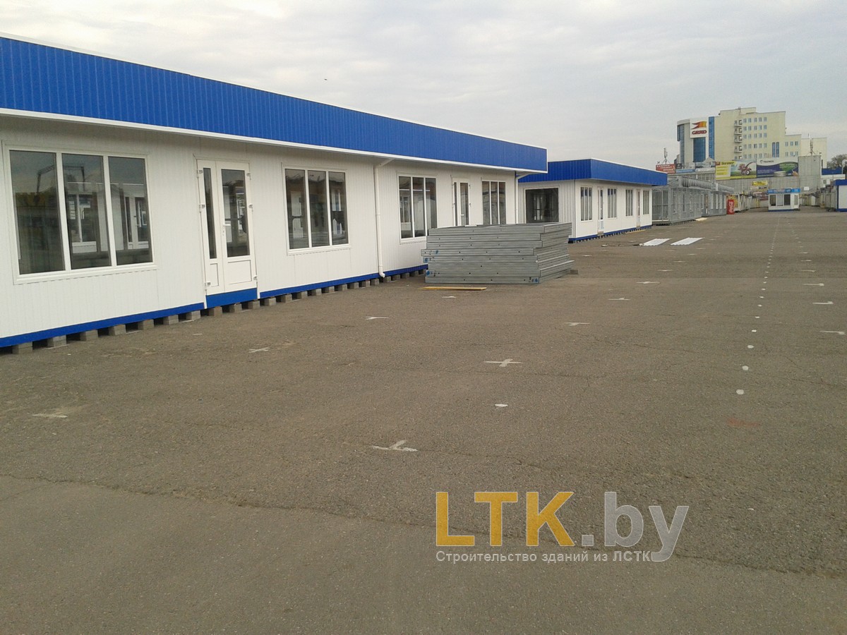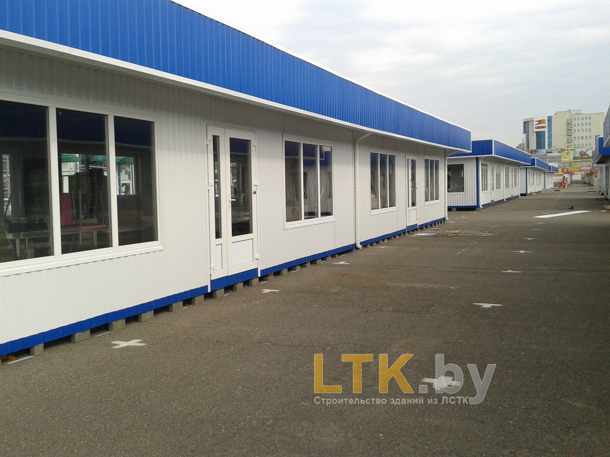 Было возведено 10 каркасных торговых павильонов по 100 м2 каждый (5 x 20 м). Благодаря низкому весу каркасной конструкции здания устанавливались на асфальтированную площадку, фундамент не потребовался.